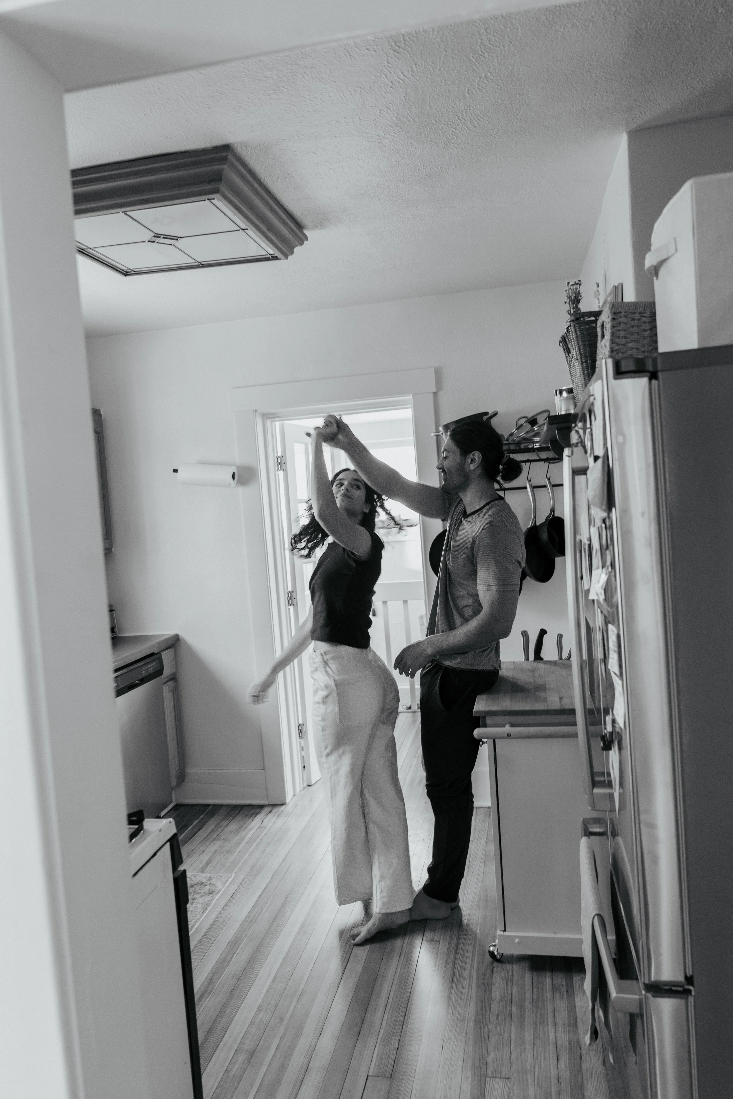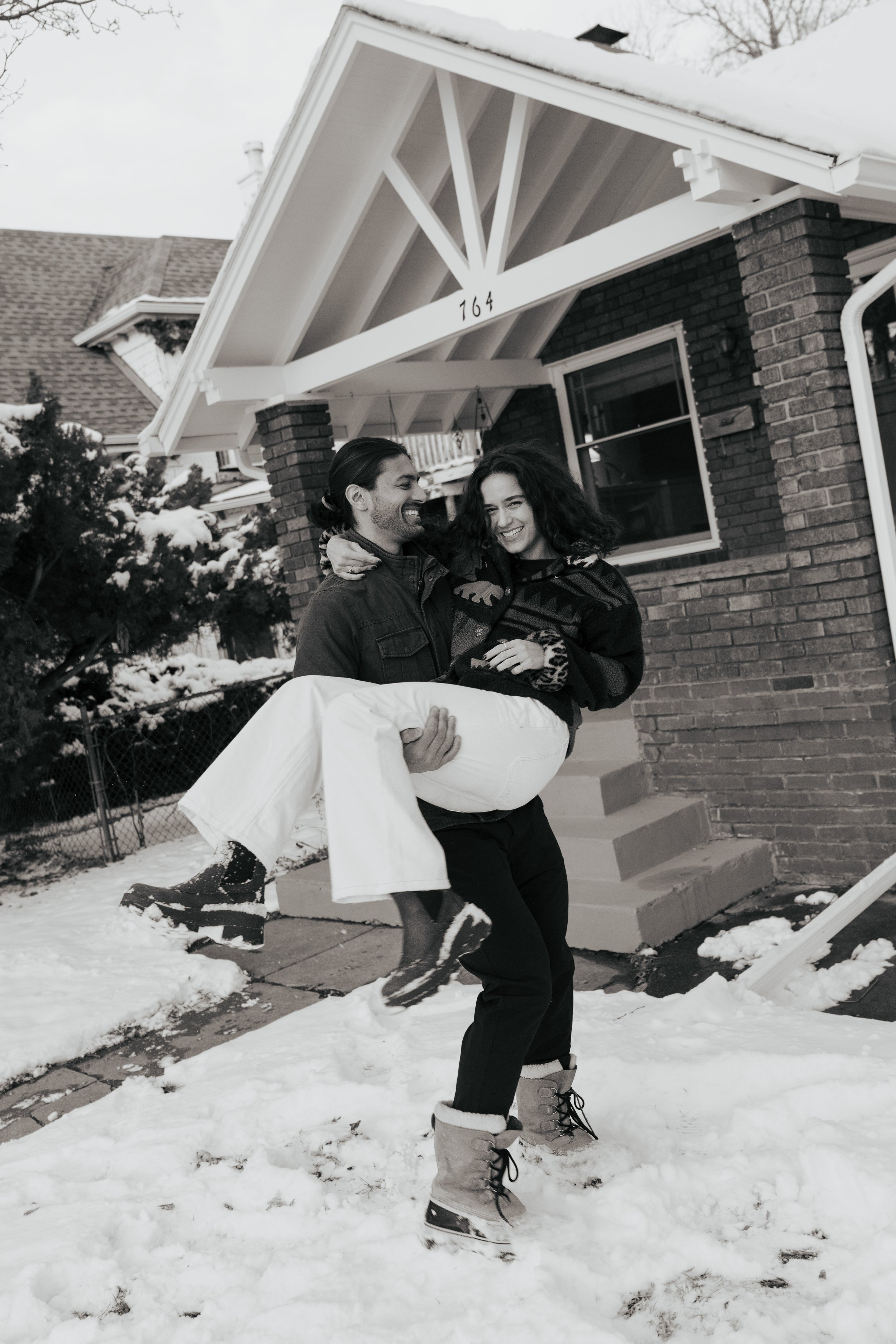 After graduation, life carried them to Chicago, and then most recently, to Denver for Charlie’s job— along with their two cats, Lola and Honey. Their blue-door Wash Park bungalow, with sunlight pouring through the dining room windows, a cozy fireplace, and a welcoming porch with windchimes, is their first home together in Colorado. They’ve settled in — with art collected from vintage markets, a hutch painted green, an office chair on its last life, and Marissa’s sourdough starter in permanent rotation on the kitchen counter.